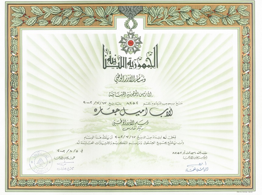 في 17 تموز عام 2002: حاز على وسام الأرز من رتبة فارس.